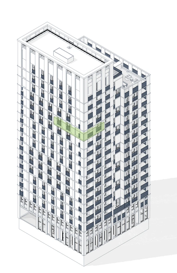 Большие окна этой угловой квартиры выходят на две стороны, поэтому дома всегда будет много света. В квартире спроектирована лоджия, где можно заниматься спортом или обустроить место для летнего отдыха.