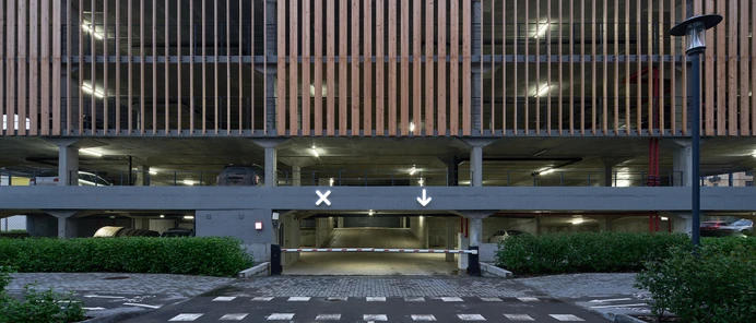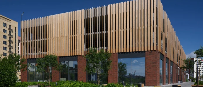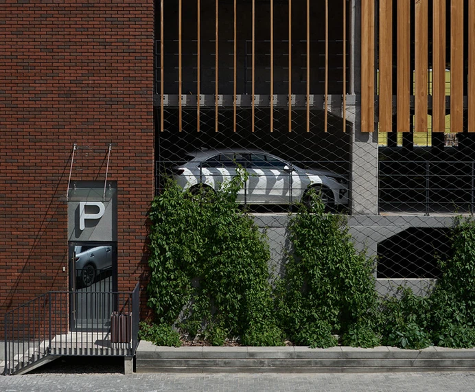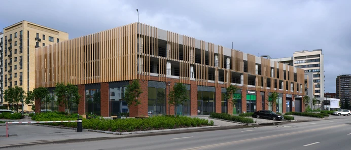 Паркинг расположен напротив торгового центра «Зелёный берег» и рассчитан на 354 места. Въезд и выезд в него находятся со стороны Европейского проезда. Необычный облик зданию придают деревянные панели, которыми облицован фасад. Они выполняют защитную функцию: препятствуют попаданию света автомобильных фар в окна рядом стоящих домов. Еще одна отличительная черта проекта — фитостена из вьющихся растений, которые выделяются на фоне красного клинкерного кирпича.